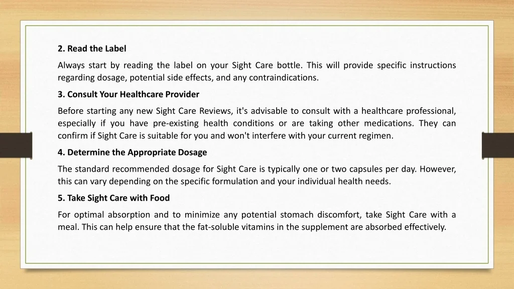 2. Read the Label Always start by reading the label on your Sight Care bottle. This will provide specific instructions regarding dosage, potential side effects, and any contraindications. 3. Consult Your Healthcare Provider Before starting any new Sight Care Reviews, it's advisable to consult with a healthcare professional, especially if you have pre-existing health conditions or are taking other medications. They can confirm if Sight Care is suitable for you and won't interfere with your current regimen. 4. Determine the Appropriate Dosage The standard recommended dosage for Sight Care is typically one or two capsules per day. However, this can vary depending on the specific formulation and your individual health needs. 5. Take Sight Care with Food For optimal absorption and to minimize any potential stomach discomfort, take Sight Care with a meal. This can help ensure that the fat-soluble vitamins in the supplement are absorbed effectively.