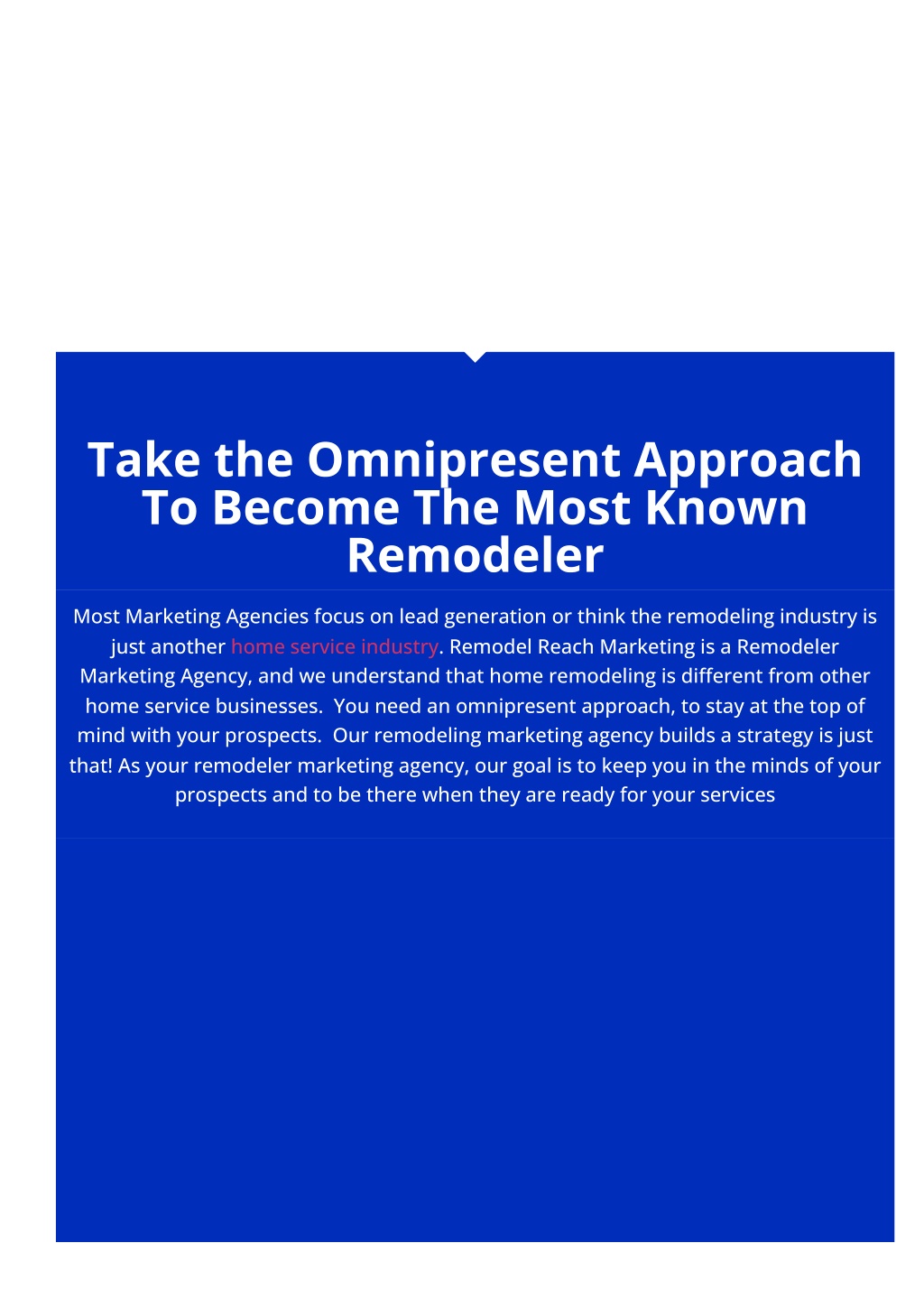 Take the Omnipresent Approach To Become The Most Known Remodeler Most Marketing Agencies focus on lead generation or think the remodeling industry is just another home service industry. Remodel Reach Marketing is a Remodeler Marketing Agency, and we understand that home remodeling is di?erent from other home service businesses. You need an omnipresent approach, to stay at the top of mind with your prospects. Our remodeling marketing agency builds a strategy is just that! As your remodeler marketing agency, our goal is to keep you in the minds of your prospects and to be there when they are ready for your services