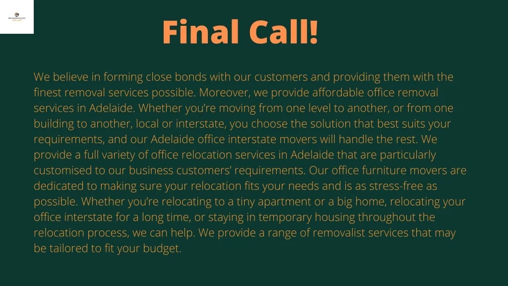 Final Call! We believe in forming close bonds with our customers and providing them with the finest removal services possible. Moreover, we provide affordable office removal services in Adelaide. Whether you’re moving from one level to another, or from one building to another, local or interstate, you choose the solution that best suits your requirements, and our Adelaide office interstate movers will handle the rest. We provide a full variety of office relocation services in Adelaide that are particularly customised to our business customers’ requirements. Our office furniture movers are dedicated to making sure your relocation fits your needs and is as stress-free as possible. Whether you’re relocating to a tiny apartment or a big home, relocating your office interstate for a long time, or staying in temporary housing throughout the relocation process, we can help. We provide a range of removalist services that may be tailored to fit your budget.