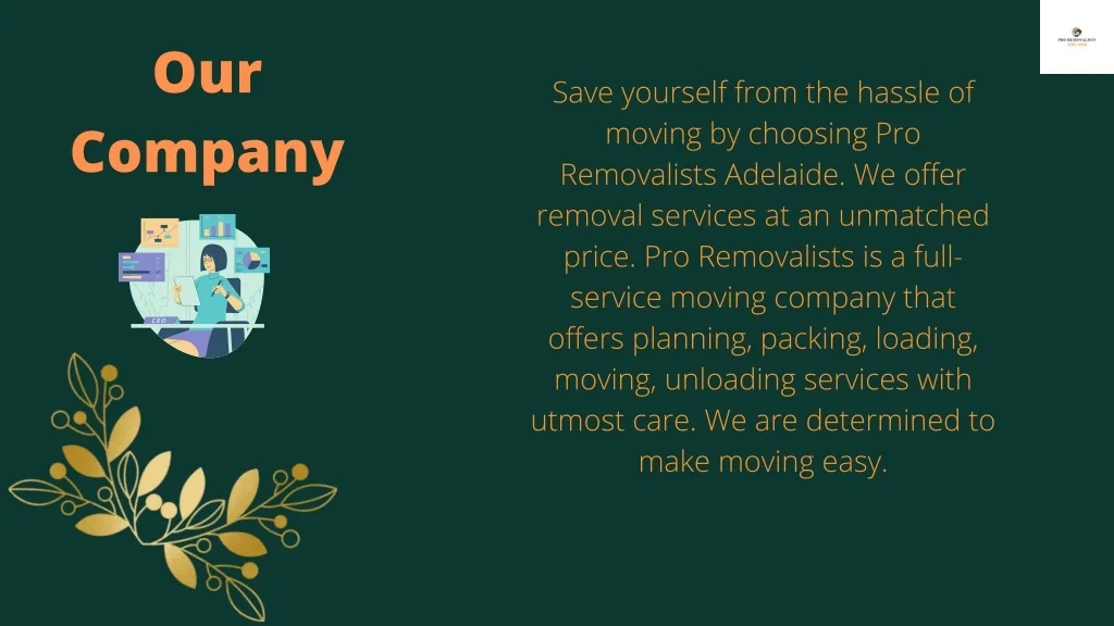Our Save yourself from the hassle of moving by choosing Pro Removalists Adelaide. We offer removal services at an unmatched price. Pro Removalists is a full- service moving company that offers planning, packing, loading, moving, unloading services with utmost care. We are determined to make moving easy. Company