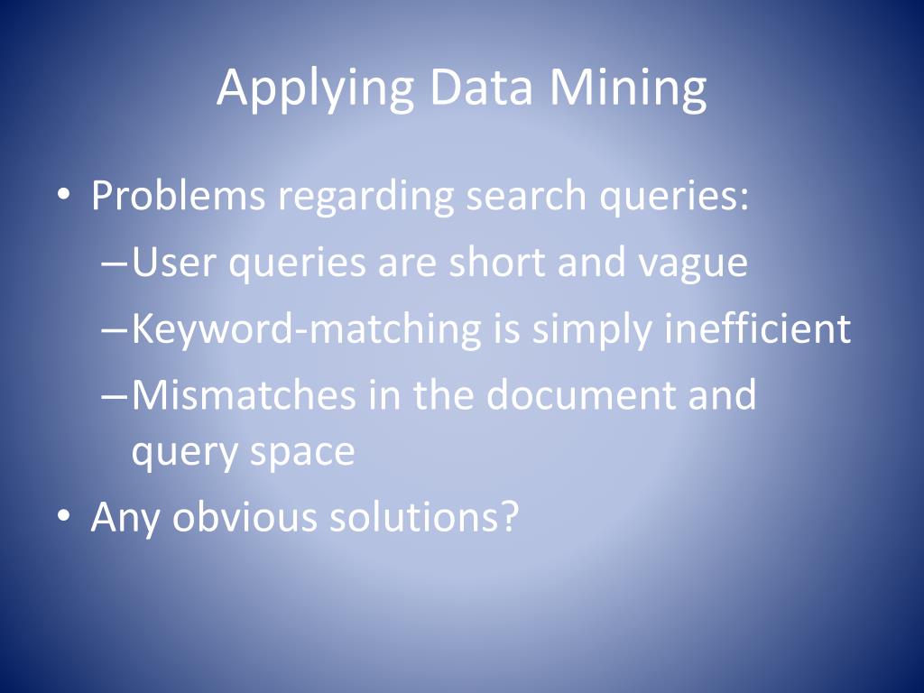 Applying Data Mining • Problems regarding search queries: • User queries are short and vague • Keyword-matching is simply inefficient • Mismatches in the document and query space • Any obvious solutions?