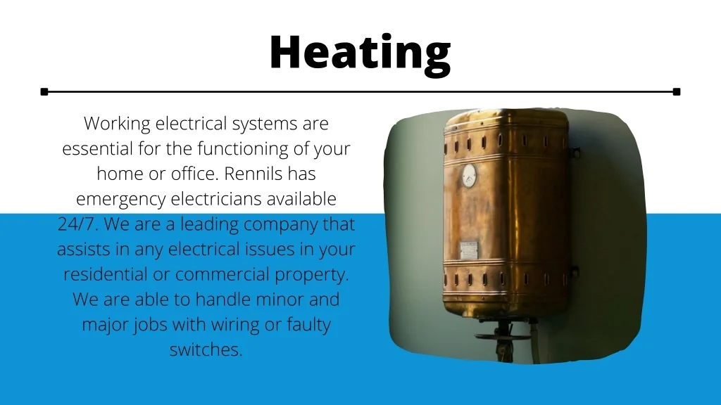 Heating Working electrical systems are essential for the functioning of your home or office. Rennils has emergency electricians available 24/7. We are a leading company that assists in any electrical issues in your residential or commercial property. We are able to handle minor and major jobs with wiring or faulty switches.