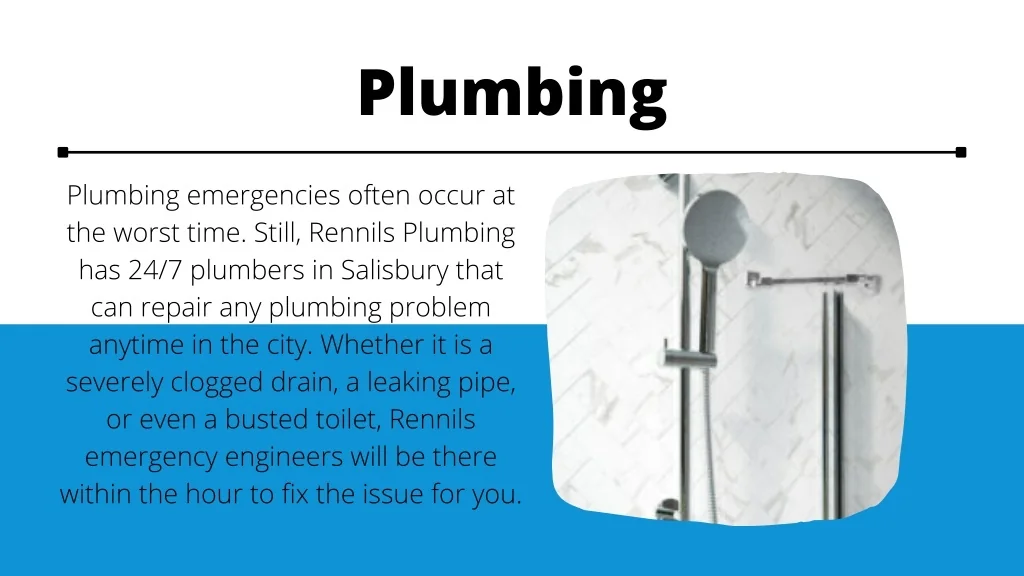 Plumbing Plumbing emergencies often occur at the worst time. Still, Rennils Plumbing has 24/7 plumbers in Salisbury that can repair any plumbing problem anytime in the city. Whether it is a severely clogged drain, a leaking pipe, or even a busted toilet, Rennils emergency engineers will be there within the hour to fix the issue for you.