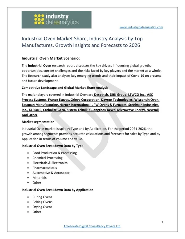 www.industrydataanalytics.com Industrial Oven Market Share, Industry Analysis by Top Manufactures, Growth Insights and Forecasts to 2026 Industrial Oven Market Scenario: The Industrial Oven research report discusses the key drivers influencing global growth, opportunities, current challenges and the risks faced by key players and the market as a whole. The Research study also analyses key emerging trends and their impact of Covid-19 on present and future development. Competitive Landscape and Global Market Share Analysis The major players covered in Industrial Oven are Despatch, DBK Group, LEWCO Inc., ASC Process Systems, France Etuves, Grieve Corporation, Davron Technologies, Wisconsin Oven, Eastman Manufacturing, Harper International, JPW Ovens & Furnaces, Steelman Industries, Inc., KERONE, Carbolite Gero, Sistem Teknik, Guangzhou Kewei Microwave Energy, Newsail And Other Market segmentation Industrial Oven market is split by Type and by Application. For the period 2021-2026, the growth among segments provides accurate calculations and forecasts for sales by Type and by Application in terms of volume and value. Industrial Oven Breakdown Data by Type •Food Production & Processing •Chemical Processing •Electricals & Electronics •Pharmaceuticals •Automotive & Aerospace •Materials •Other Industrial Oven Breakdown Data by Application •Curing Ovens •Baking Ovens •Drying Ovens •Other 1 Ameliorate Digital Consultancy Private Ltd.