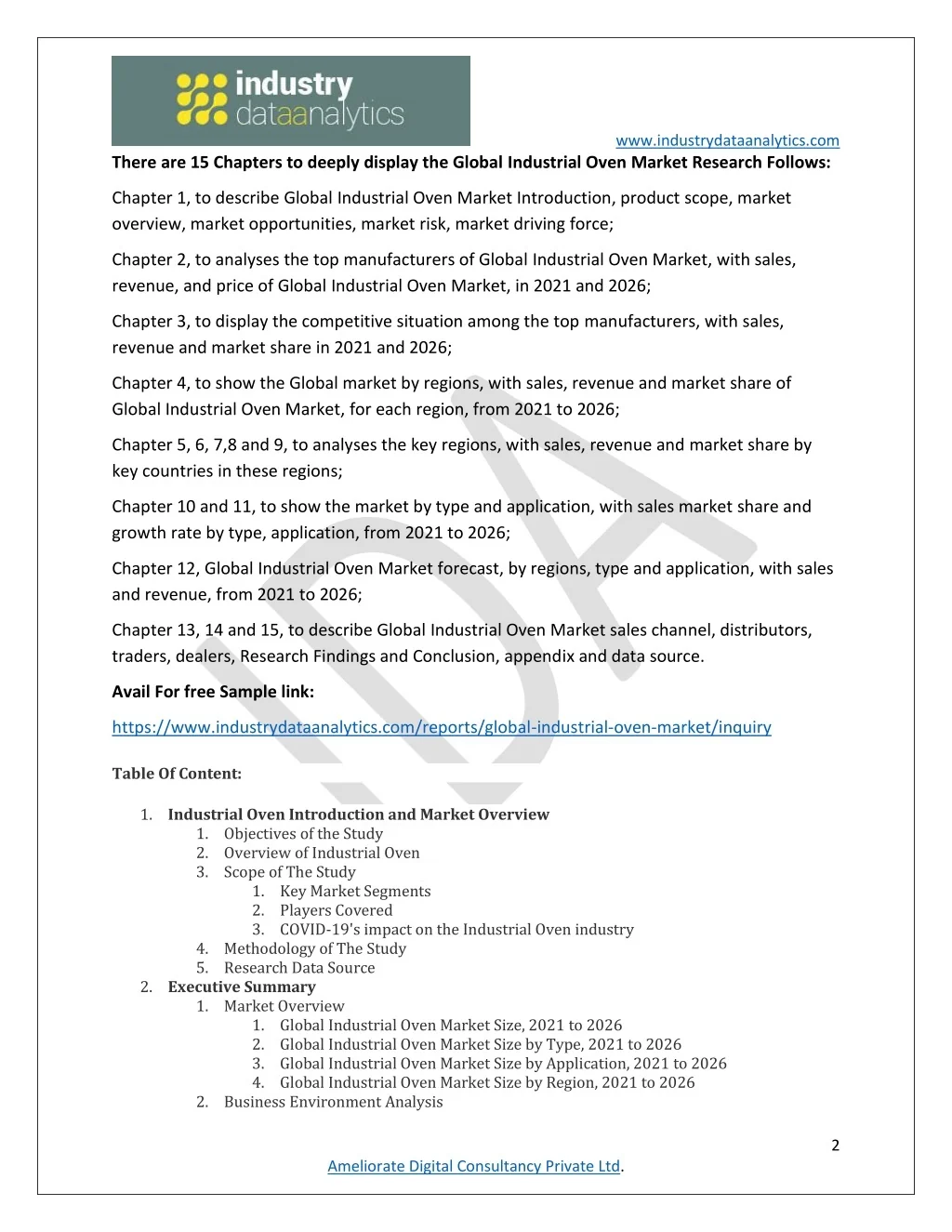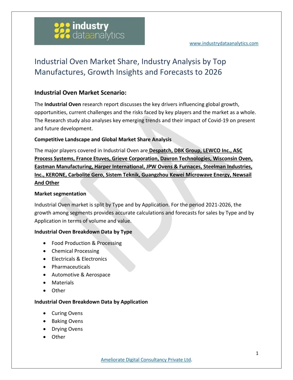 www.industrydataanalytics.com There are 15 Chapters to deeply display the Global Industrial Oven Market Research Follows: Chapter 1, to describe Global Industrial Oven Market Introduction, product scope, market overview, market opportunities, market risk, market driving force; Chapter 2, to analyses the top manufacturers of Global Industrial Oven Market, with sales, revenue, and price of Global Industrial Oven Market, in 2021 and 2026; Chapter 3, to display the competitive situation among the top manufacturers, with sales, revenue and market share in 2021 and 2026; Chapter 4, to show the Global market by regions, with sales, revenue and market share of Global Industrial Oven Market, for each region, from 2021 to 2026; Chapter 5, 6, 7,8 and 9, to analyses the key regions, with sales, revenue and market share by key countries in these regions; Chapter 10 and 11, to show the market by type and application, with sales market share and growth rate by type, application, from 2021 to 2026; Chapter 12, Global Industrial Oven Market forecast, by regions, type and application, with sales and revenue, from 2021 to 2026; Chapter 13, 14 and 15, to describe Global Industrial Oven Market sales channel, distributors, traders, dealers, Research Findings and Conclusion, appendix and data source. Avail For free Sample link: https://www.industrydataanalytics.com/reports/global-industrial-oven-market/inquiry Table Of Content: 1.Industrial Oven Introduction and Market Overview 1.Objectives of the Study 2.Overview of Industrial Oven 3.Scope of The Study 1.Key Market Segments 2.Players Covered 3.COVID-19's impact on the Industrial Oven industry 4.Methodology of The Study 5.Research Data Source 2.Executive Summary 1.Market Overview 1.Global Industrial Oven Market Size, 2021 to 2026 2.Global Industrial Oven Market Size by Type, 2021 to 2026 3.Global Industrial Oven Market Size by Application, 2021 to 2026 4.Global Industrial Oven Market Size by Region, 2021 to 2026 2.Business Environment Analysis 2 Ameliorate Digital Consultancy Private Ltd.