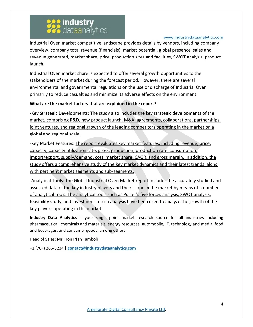 www.industrydataanalytics.com Industrial Oven market competitive landscape provides details by vendors, including company overview, company total revenue (financials), market potential, global presence, sales and revenue generated, market share, price, production sites and facilities, SWOT analysis, product launch. Industrial Oven market share is expected to offer several growth opportunities to the stakeholders of the market during the forecast period. However, there are several environmental and governmental regulations on the use or discharge of Industrial Oven primarily to reduce casualties and minimize its adverse effects on the environment. What are the market factors that are explained in the report? -Key Strategic Developments: The study also includes the key strategic developments of the market, comprising R&D, new product launch, M&A, agreements, collaborations, partnerships, joint ventures, and regional growth of the leading competitors operating in the market on a global and regional scale. -Key Market Features: The report evaluates key market features, including revenue, price, capacity, capacity utilization rate, gross, production, production rate, consumption, import/export, supply/demand, cost, market share, CAGR, and gross margin. In addition, the study offers a comprehensive study of the key market dynamics and their latest trends, along with pertinent market segments and sub-segments. -Analytical Tools: The Global Industrial Oven Market report includes the accurately studied and assessed data of the key industry players and their scope in the market by means of a number of analytical tools. The analytical tools such as Porter's five forces analysis, SWOT analysis, feasibility study, and investment return analysis have been used to analyze the growth of the key players operating in the market. Industry Data Analytics is your single point market research source for all industries including pharmaceutical, chemicals and materials, energy resources, automobile, IT, technology and media, food and beverages, and consumer goods, among others. Head of Sales: Mr. Hon Irfan Tamboli +1 (704) 266-3234 | contact@industrydataanalytics.com 4 Ameliorate Digital Consultancy Private Ltd.
