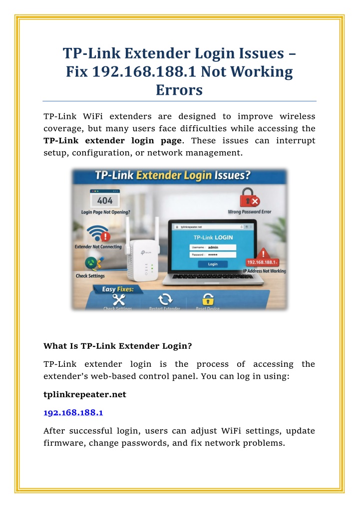 This PDF covers common TP-Link extender login issues, including login page not opening, wrong password errors, and 192.168.188.1 not working problems. Learn quick fixes to access tplinkrepeater.net, connect the extender to the router, and restore WiFi smoothly.