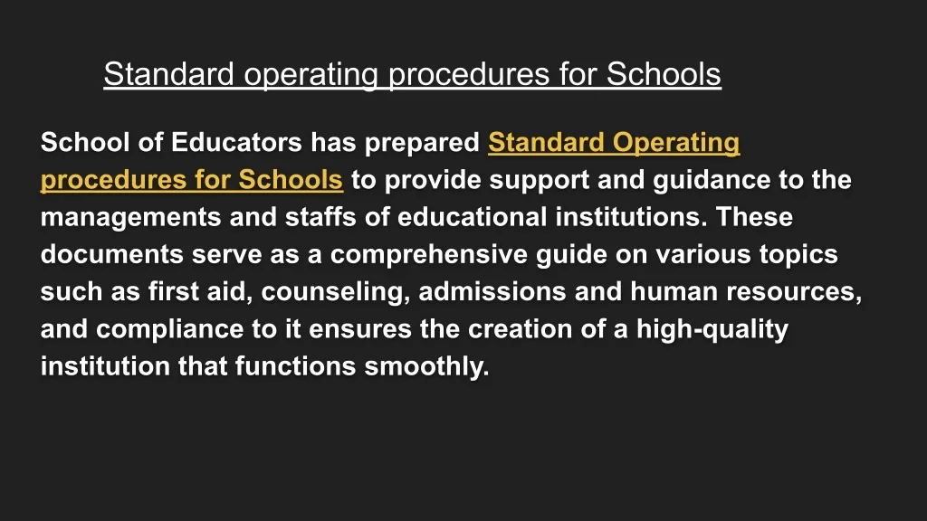 Standard operating procedures for Schools School of Educators has prepared Standard Operating procedures for Schools to provide support and guidance to the managements and staffs of educational institutions. These documents serve as a comprehensive guide on various topics such as first aid, counseling, admissions and human resources, and compliance to it ensures the creation of a high-quality institution that functions smoothly.