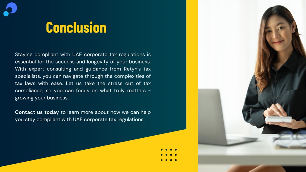 Conclusion Staying compliant with UAE corporate tax regulations is essential for the success and longevity of your business. With expert consulting and guidance from Retyn's tax specialists, you can navigate through the complexities of tax laws with ease. Let us take the stress out of tax compliance, so you can focus on what truly matters - growing your business. Contact us today to learn more about how we can help you stay compliant with UAE corporate tax regulations.