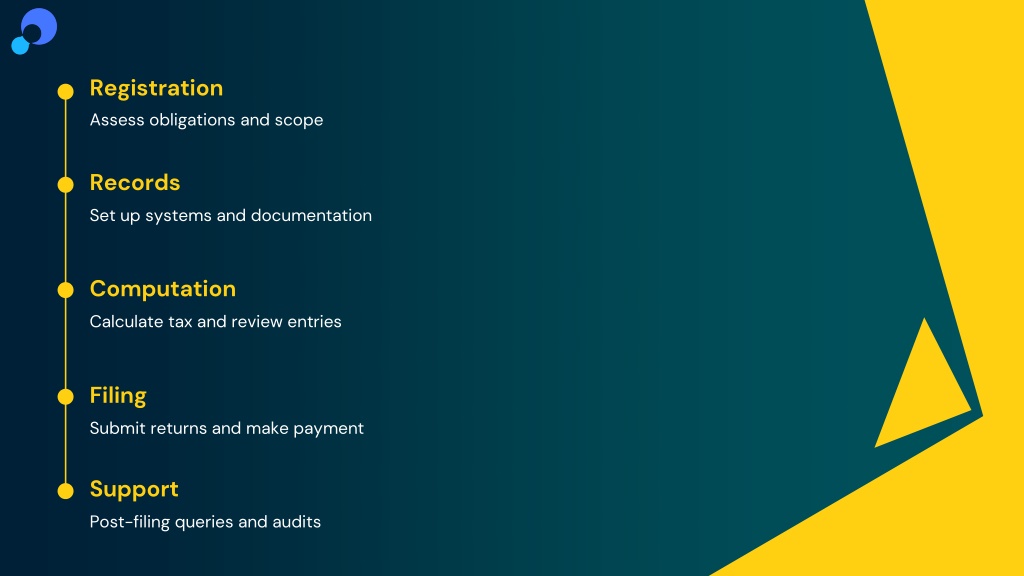 Registration Assess obligations and scope Records Set up systems and documentation Computation Calculate tax and review entries Filing Submit returns and make payment Support Post-filing queries and audits