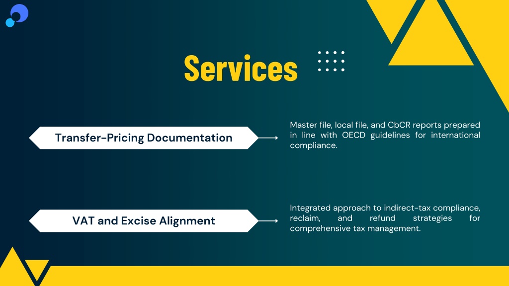 Services Master file, local file, and CbCR reports prepared in line with OECD guidelines for international compliance. Transfer-Pricing Documentation Integrated approach to indirect-tax compliance, reclaim, and refund strategies for comprehensive tax management. VAT and Excise Alignment