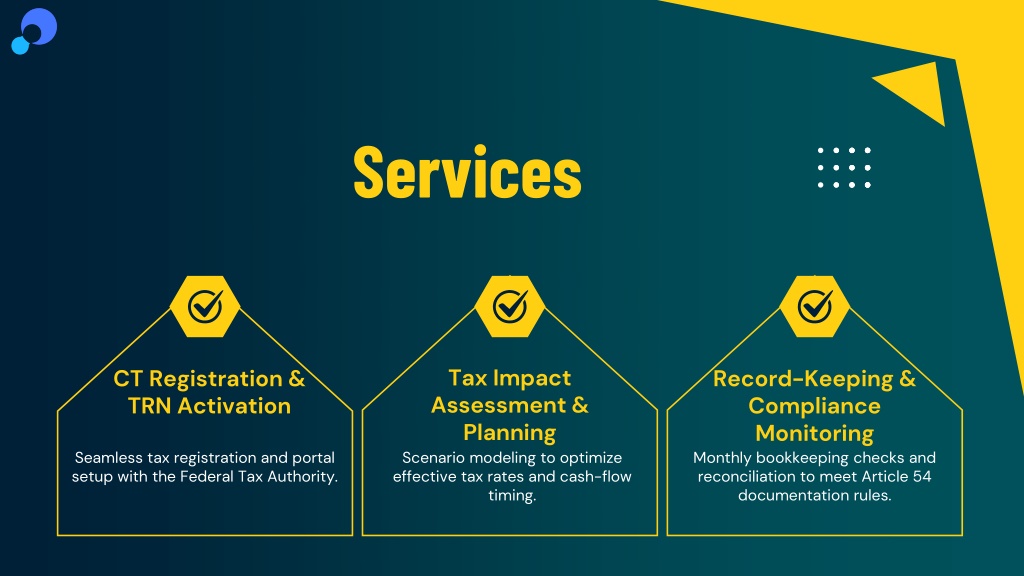Services Tax Impact Assessment & Planning CT Registration & TRN Activation Record-Keeping & Compliance Monitoring Seamless tax registration and portal setup with the Federal Tax Authority. Scenario modeling to optimize effective tax rates and cash-flow timing. Monthly bookkeeping checks and reconciliation to meet Article 54 documentation rules.