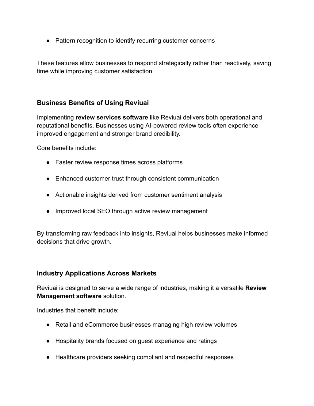 ● Pattern recognition to identify recurring customer concerns These features allow businesses to respond strategically rather than reactively, saving time while improving customer satisfaction. Business Benefits of Using Reviuai Implementing review services software like Reviuai delivers both operational and reputational benefits. Businesses using AI-powered review tools often experience improved engagement and stronger brand credibility. Core benefits include: ● Faster review response times across platforms ● Enhanced customer trust through consistent communication ● Actionable insights derived from customer sentiment analysis ● Improved local SEO through active review management By transforming raw feedback into insights, Reviuai helps businesses make informed decisions that drive growth. Industry Applications Across Markets Reviuai is designed to serve a wide range of industries, making it a versatile Review Management software solution. Industries that benefit include: ● Retail and eCommerce businesses managing high review volumes ● Hospitality brands focused on guest experience and ratings ● Healthcare providers seeking compliant and respectful responses