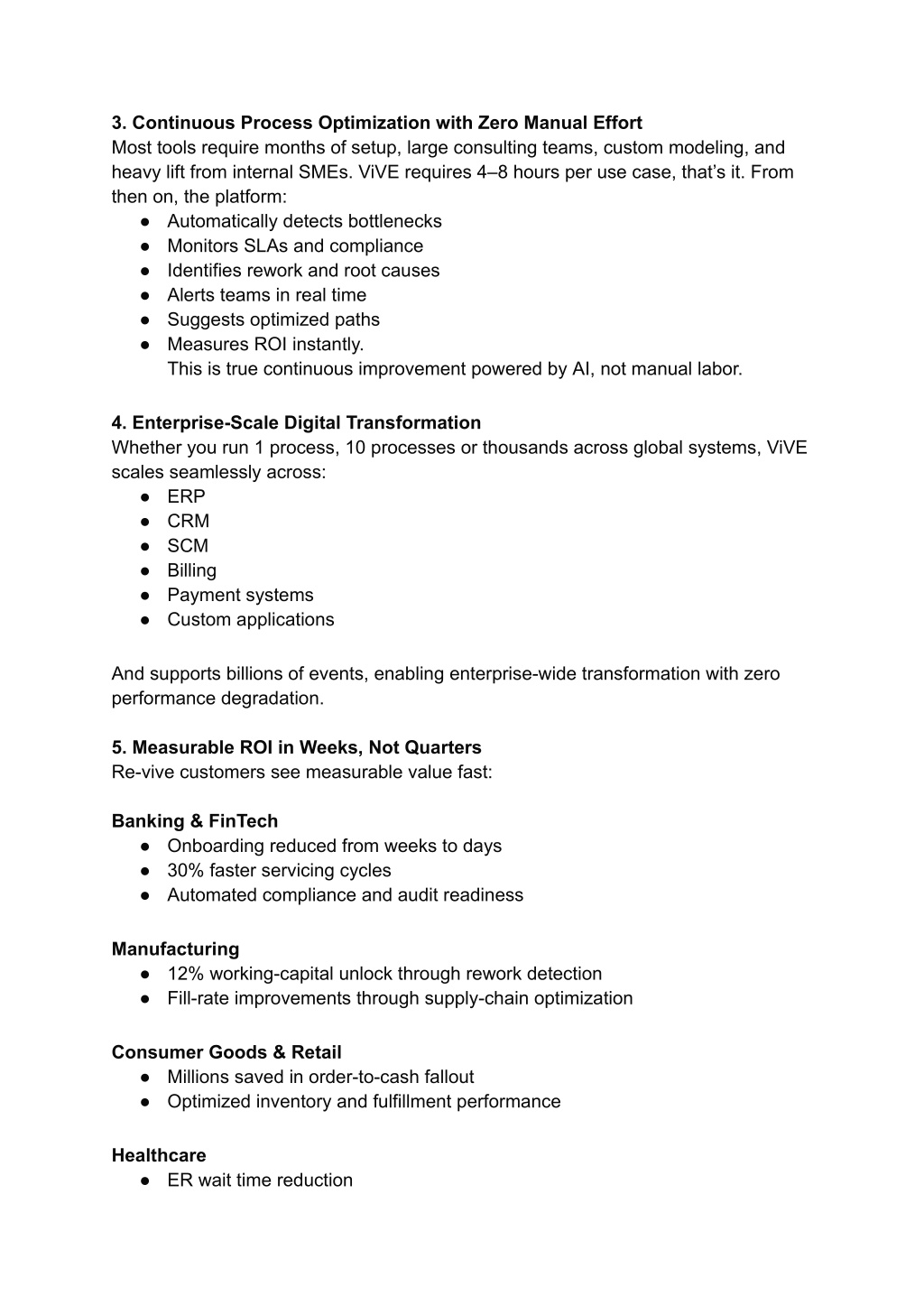3. Continuous Process Optimization with Zero Manual Effort Most tools require months of setup, large consulting teams, custom modeling, and heavy lift from internal SMEs. ViVE requires 4–8 hours per use case, that’s it. From then on, the platform: ● Automatically detects bottlenecks ● Monitors SLAs and compliance ● Identifies rework and root causes ● Alerts teams in real time ● Suggests optimized paths ● Measures ROI instantly. This is true continuous improvement powered by AI, not manual labor. 4. Enterprise-Scale Digital Transformation Whether you run 1 process, 10 processes or thousands across global systems, ViVE scales seamlessly across: ● ERP ● CRM ● SCM ● Billing ● Payment systems ● Custom applications And supports billions of events, enabling enterprise-wide transformation with zero performance degradation. 5. Measurable ROI in Weeks, Not Quarters Re-vive customers see measurable value fast: Banking & FinTech ● Onboarding reduced from weeks to days ● 30% faster servicing cycles ● Automated compliance and audit readiness Manufacturing ● 12% working-capital unlock through rework detection ● Fill-rate improvements through supply-chain optimization Consumer Goods & Retail ● Millions saved in order-to-cash fallout ● Optimized inventory and fulfillment performance Healthcare ● ER wait time reduction