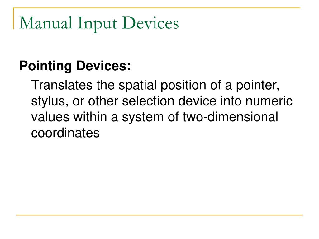 Manual Input Devices Pointing Devices: Translates the spatial position of a pointer, stylus, or other selection device into numeric values within a system of two-dimensional coordinates