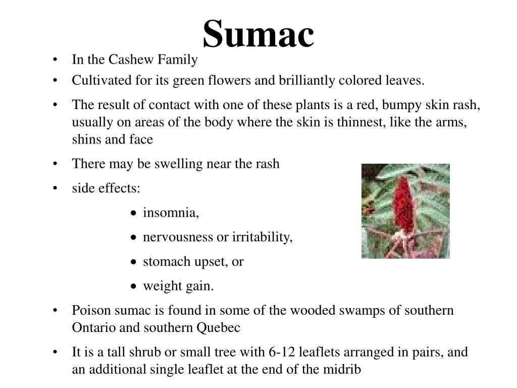 Sumac • In the Cashew Family • Cultivated for its green flowers and brilliantly colored leaves. • The result of contact with one of these plants is a red, bumpy skin rash, usually on areas of the body where the skin is thinnest, like the arms, shins and face • There may be swelling near the rash • side effects: • insomnia, • nervousness or irritability, • stomach upset, or • weight gain. • Poison sumac is found in some of the wooded swamps of southern Ontario and southern Quebec • It is a tall shrub or small tree with 6-12 leaflets arranged in pairs, and an additional single leaflet at the end of the midrib