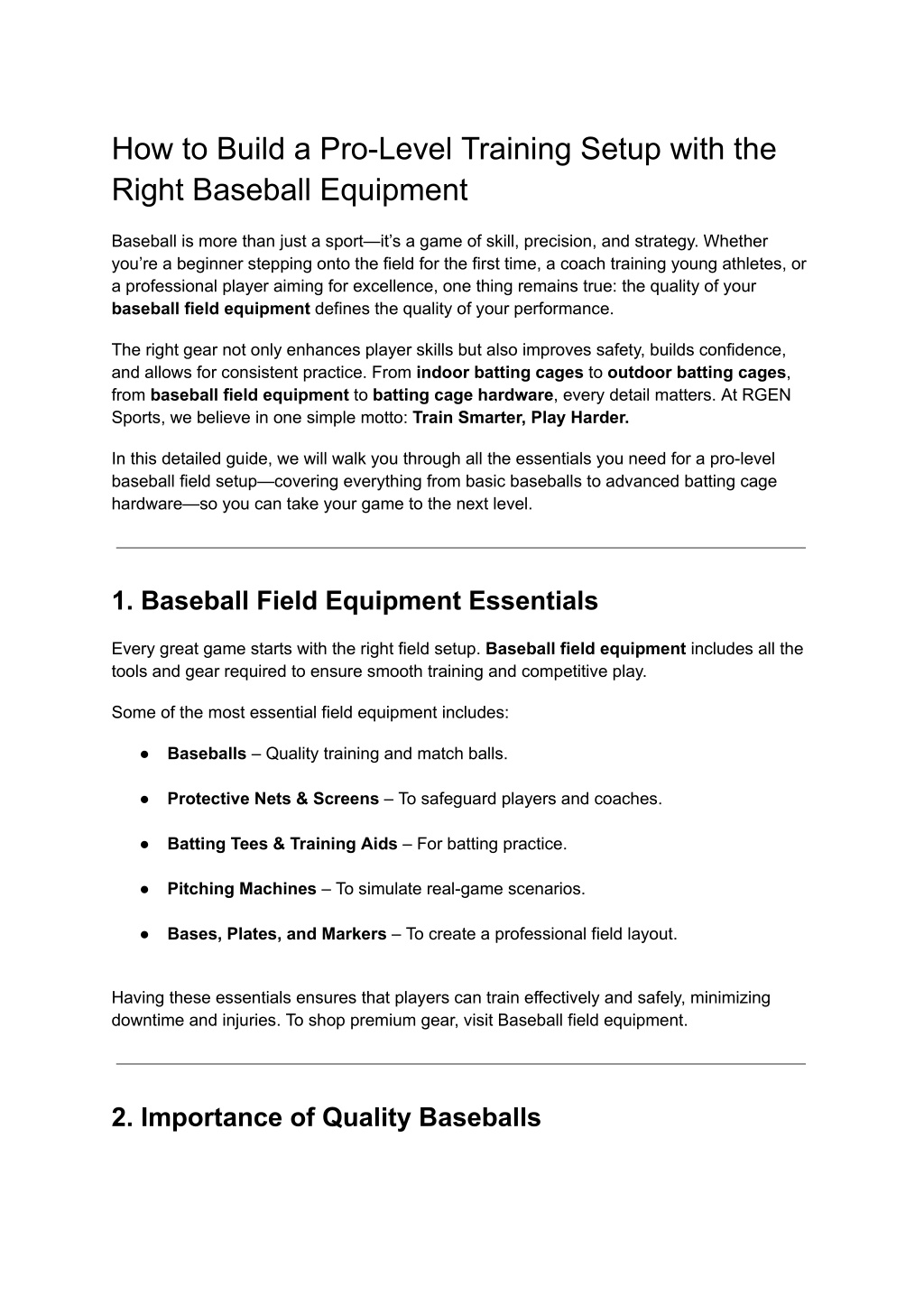 How to Build a Pro-Level Training Setup with the Right Baseball Equipment Baseball is more than just a sport—it’s a game of skill, precision, and strategy. Whether you’re a beginner stepping onto the field for the first time, a coach training young athletes, or a professional player aiming for excellence, one thing remains true: the quality of your baseball field equipment defines the quality of your performance. The right gear not only enhances player skills but also improves safety, builds confidence, and allows for consistent practice. From indoor batting cages to outdoor batting cages, from baseball field equipment to batting cage hardware, every detail matters. At RGEN Sports, we believe in one simple motto: Train Smarter, Play Harder. In this detailed guide, we will walk you through all the essentials you need for a pro-level baseball field setup—covering everything from basic baseballs to advanced batting cage hardware—so you can take your game to the next level. 1. Baseball Field Equipment Essentials Every great game starts with the right field setup. Baseball field equipment includes all the tools and gear required to ensure smooth training and competitive play. Some of the most essential field equipment includes: ● Baseballs – Quality training and match balls. ● Protective Nets & Screens – To safeguard players and coaches. ● Batting Tees & Training Aids – For batting practice. ● Pitching Machines – To simulate real-game scenarios. ● Bases, Plates, and Markers – To create a professional field layout. Having these essentials ensures that players can train effectively and safely, minimizing downtime and injuries. To shop premium gear, visit Baseball field equipment. 2. Importance of Quality Baseballs