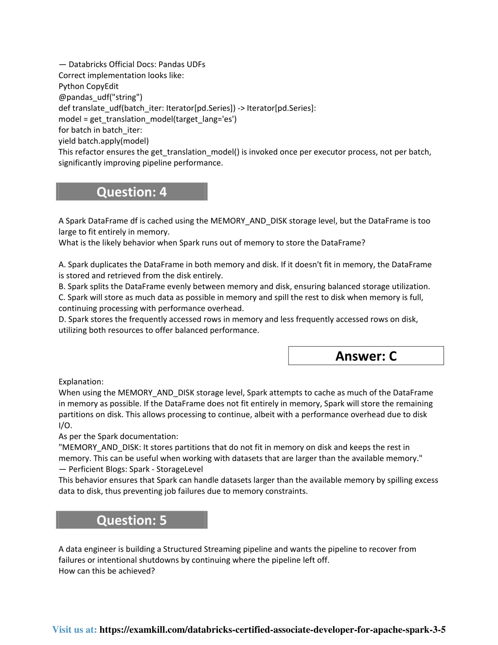 5. — Databricks Official Docs: Pandas UDFs Correct implementation looks like: Python CopyEdit @pandas_udf("string") def translate_udf(batch_iter: Iterator[pd.Series]) -> Iterator[pd.Series]: model = get_translation_model(target_lang='es') for batch in batch_iter: yield batch.apply(model) This refactor ensures the get_translation_model() is invoked once per executor process, not per batch, significantly improving pipeline performance. Question: 4 A Spark DataFrame df is cached using the MEMORY_AND_DISK storage level, but the DataFrame is too large to fit entirely in memory. What is the likely behavior when Spark runs out of memory to store the DataFrame? A. Spark duplicates the DataFrame in both memory and disk. If it doesn't fit in memory, the DataFrame is stored and retrieved from the disk entirely. B. Spark splits the DataFrame evenly between memory and disk, ensuring balanced storage utilization. C. Spark will store as much data as possible in memory and spill the rest to disk when memory is full, continuing processing with performance overhead. D. Spark stores the frequently accessed rows in memory and less frequently accessed rows on disk, utilizing both resources to offer balanced performance. Answer: C Explanation: When using the MEMORY_AND_DISK storage level, Spark attempts to cache as much of the DataFrame in memory as possible. If the DataFrame does not fit entirely in memory, Spark will store the remaining partitions on disk. This allows processing to continue, albeit with a performance overhead due to disk I/O. As per the Spark documentation: "MEMORY_AND_DISK: It stores partitions that do not fit in memory on disk and keeps the rest in memory. This can be useful when working with datasets that are larger than the available memory." — Perficient Blogs: Spark - StorageLevel This behavior ensures that Spark can handle datasets larger than the available memory by spilling excess data to disk, thus preventing job failures due to memory constraints. Question: 5 A data engineer is building a Structured Streaming pipeline and wants the pipeline to recover from failures or intentional shutdowns by continuing where the pipeline left off. How can this be achieved? Visit us at: https://examkill.com/databricks-certified-associate-developer-for-apache-spark-3-5