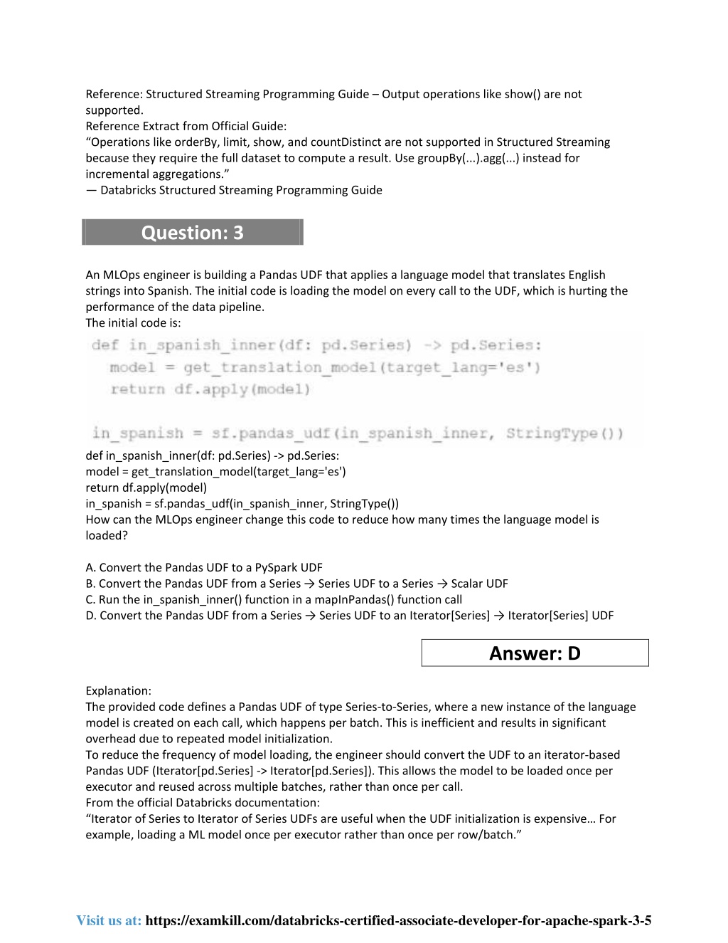 4. Reference: Structured Streaming Programming Guide – Output operations like show() are not supported. Reference Extract from Official Guide: “Operations like orderBy, limit, show, and countDistinct are not supported in Structured Streaming because they require the full dataset to compute a result. Use groupBy(...).agg(...) instead for incremental aggregations.” — Databricks Structured Streaming Programming Guide Question: 3 An MLOps engineer is building a Pandas UDF that applies a language model that translates English strings into Spanish. The initial code is loading the model on every call to the UDF, which is hurting the performance of the data pipeline. The initial code is: def in_spanish_inner(df: pd.Series) -> pd.Series: model = get_translation_model(target_lang='es') return df.apply(model) in_spanish = sf.pandas_udf(in_spanish_inner, StringType()) How can the MLOps engineer change this code to reduce how many times the language model is loaded? A. Convert the Pandas UDF to a PySpark UDF B. Convert the Pandas UDF from a Series → Series UDF to a Series → Scalar UDF C. Run the in_spanish_inner() function in a mapInPandas() function call D. Convert the Pandas UDF from a Series → Series UDF to an Iterator[Series] → Iterator[Series] UDF Answer: D Explanation: The provided code defines a Pandas UDF of type Series-to-Series, where a new instance of the language model is created on each call, which happens per batch. This is inefficient and results in significant overhead due to repeated model initialization. To reduce the frequency of model loading, the engineer should convert the UDF to an iterator-based Pandas UDF (Iterator[pd.Series] -> Iterator[pd.Series]). This allows the model to be loaded once per executor and reused across multiple batches, rather than once per call. From the official Databricks documentation: “Iterator of Series to Iterator of Series UDFs are useful when the UDF initialization is expensive… For example, loading a ML model once per executor rather than once per row/batch.” Visit us at: https://examkill.com/databricks-certified-associate-developer-for-apache-spark-3-5