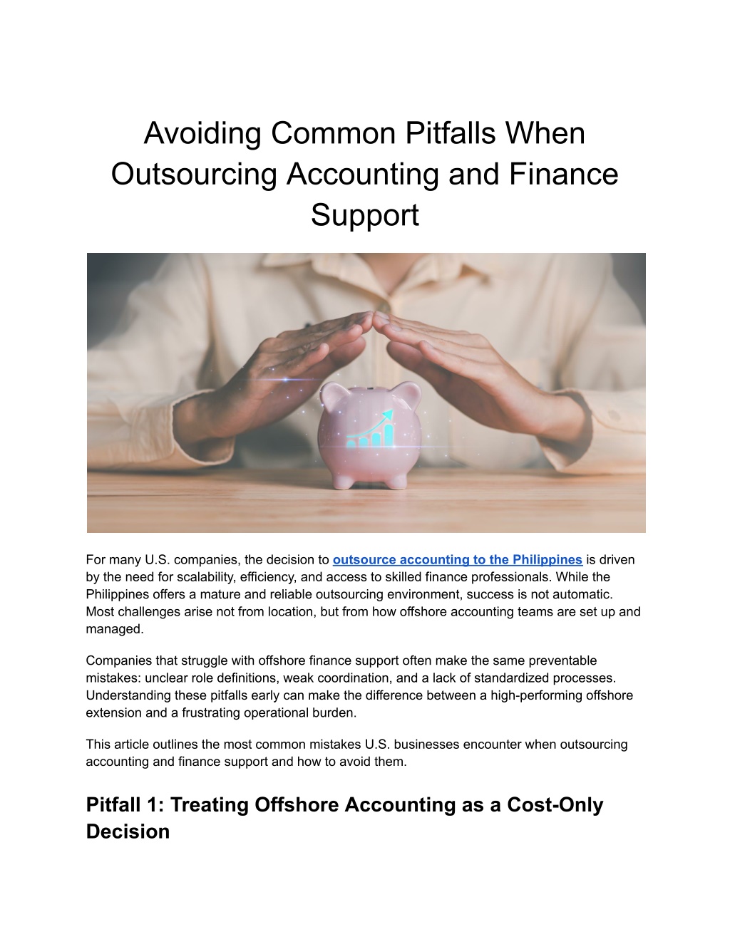 Avoiding Common Pitfalls When Outsourcing Accounting and Finance Support For many U.S. companies, the decision to outsource accounting to the Philippines is driven by the need for scalability, efficiency, and access to skilled finance professionals. While the Philippines offers a mature and reliable outsourcing environment, success is not automatic. Most challenges arise not from location, but from how offshore accounting teams are set up and managed. Companies that struggle with offshore finance support often make the same preventable mistakes: unclear role definitions, weak coordination, and a lack of standardized processes. Understanding these pitfalls early can make the difference between a high-performing offshore extension and a frustrating operational burden. This article outlines the most common mistakes U.S. businesses encounter when outsourcing accounting and finance support and how to avoid them. Pitfall 1: Treating Offshore Accounting as a Cost-Only Decision