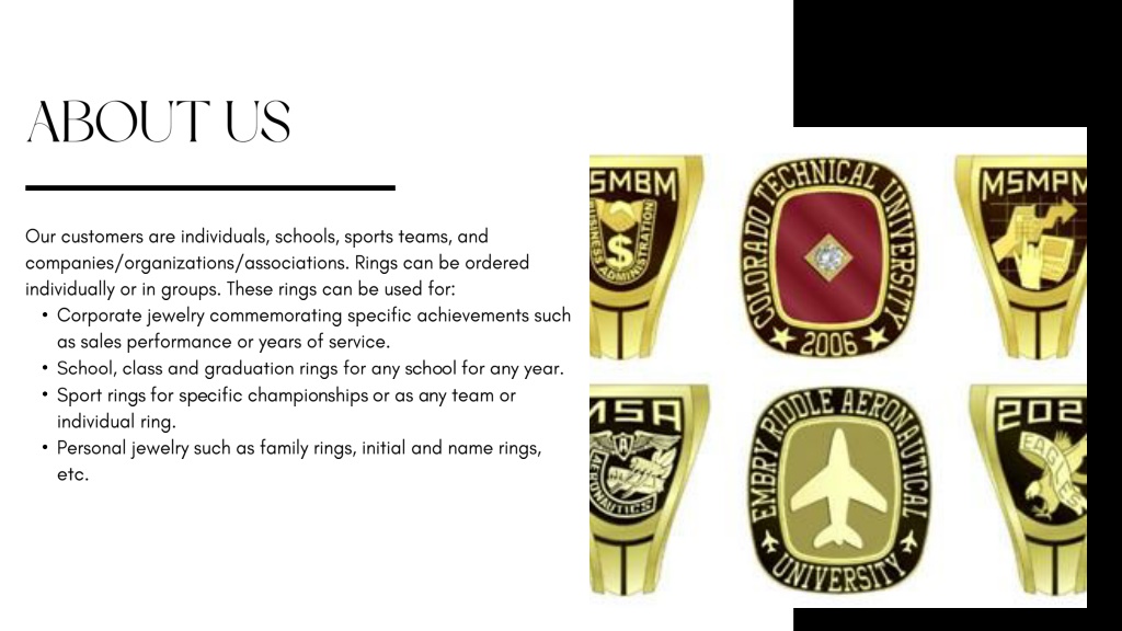 2. ABOUT US • Our customers are individuals, schools, sports teams, and companies/organizations/associations. Rings can be ordered individually or in groups. These rings can be used for: • Corporate jewelry commemorating specific achievements such as sales performance or years of service. • School, class and graduation rings for any school for any year. • Sport rings for specificchampionships or as any team or individual ring. • Personal jewelry such as family rings, initial and name rings, etc.