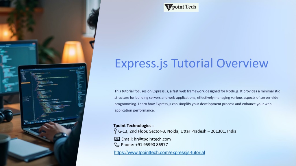 Express.js Tutorial Overview This tutorial focuses on Express.js, a fast web framework designed for Node.js. It provides a minimalistic structure for building servers and web applications, effectively managing various aspects of server-side programming. Learn how Express.js can simplify your development process and enhance your web application performance. Tpoint Technologies : 📍 G-13, 2nd Floor, Sector-3, Noida, Uttar Pradesh – 201301, India 📧 Email: hr@tpointtech.com📞 Phone: +91 95990 86977 https://www.tpointtech.com/expressjs-tutorial