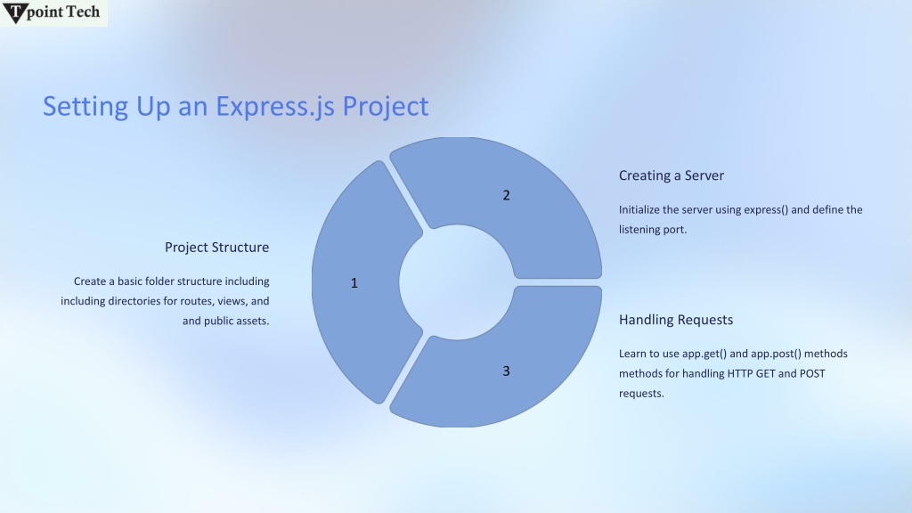 Setting Up an Express.js Project Creating a Server 2 Initialize the server using express() and define the listening port. Project Structure Create a basic folder structure including directories for routes, views, and public assets. 1 Handling Requests Learn to use app.get() and app.post() methods for handling HTTP GET and POST requests. 3