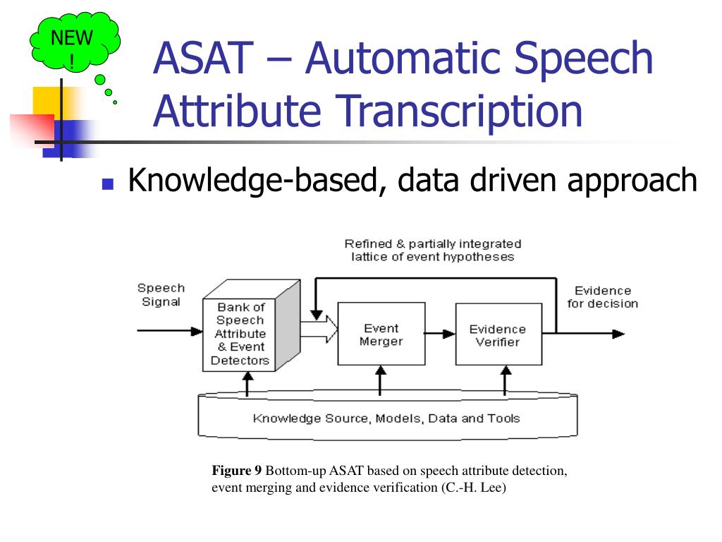 Figure 9 Bottom-up ASAT based on speech attribute detection, event merging and evidence verification (C.-H. Lee) NEW! ASAT – Automatic Speech Attribute Transcription • Knowledge-based, data driven approach