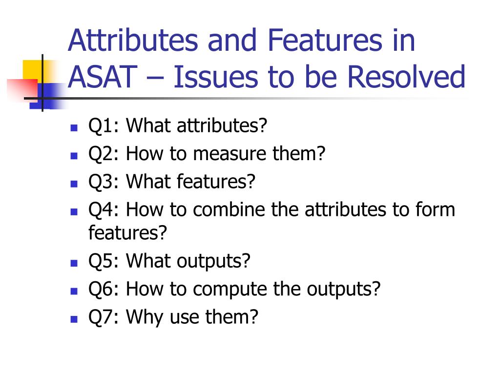 Attributes and Features in ASAT – Issues to be Resolved • Q1: What attributes? • Q2: How to measure them? • Q3: What features? • Q4: How to combine the attributes to form features? • Q5: What outputs? • Q6: How to compute the outputs? • Q7: Why use them?