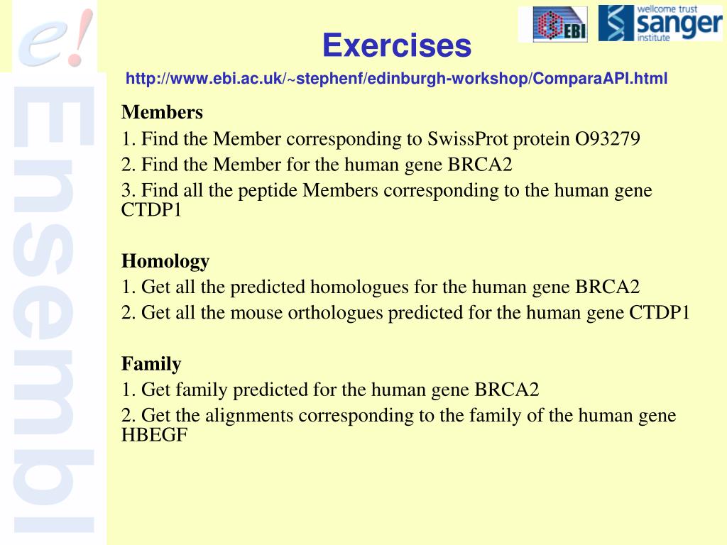 Exerciseshttp://www.ebi.ac.uk/~stephenf/edinburgh-workshop/ComparaAPI.htmlExerciseshttp://www.ebi.ac.uk/~stephenf/edinburgh-workshop/ComparaAPI.html Members 1. Find the Member corresponding to SwissProt protein O93279 2. Find the Member for the human gene BRCA2 3. Find all the peptide Members corresponding to the human gene CTDP1 Homology 1. Get all the predicted homologues for the human gene BRCA2 2. Get all the mouse orthologues predicted for the human gene CTDP1 Family 1. Get family predicted for the human gene BRCA2 2. Get the alignments corresponding to the family of the human gene HBEGF