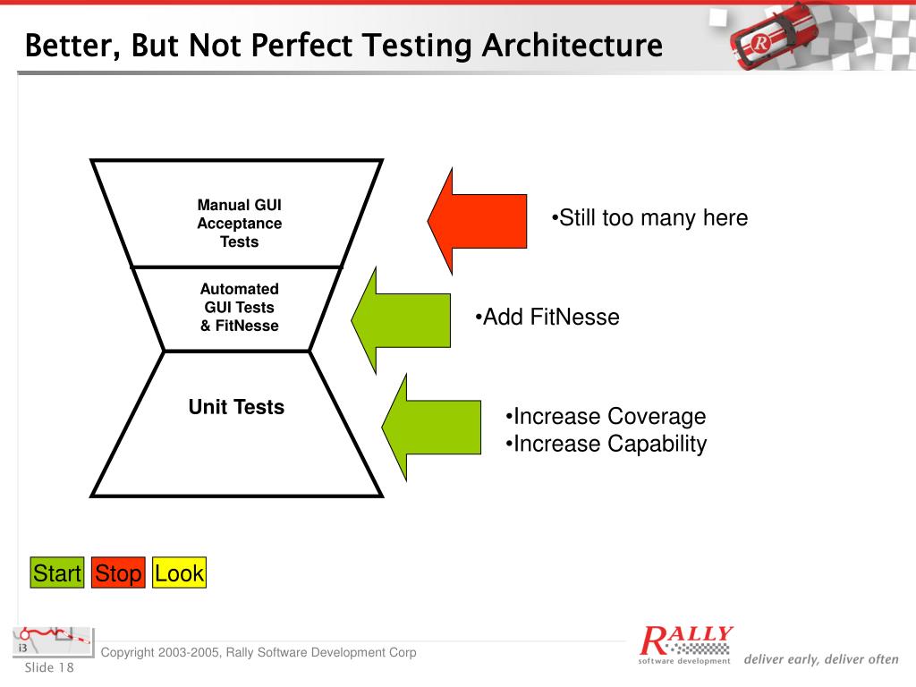 Manual GUI Acceptance Tests Automated GUI Tests & FitNesse Unit Tests Better, But Not Perfect Testing Architecture • Still too many here • Add FitNesse • Increase Coverage • Increase Capability Start Stop Look
