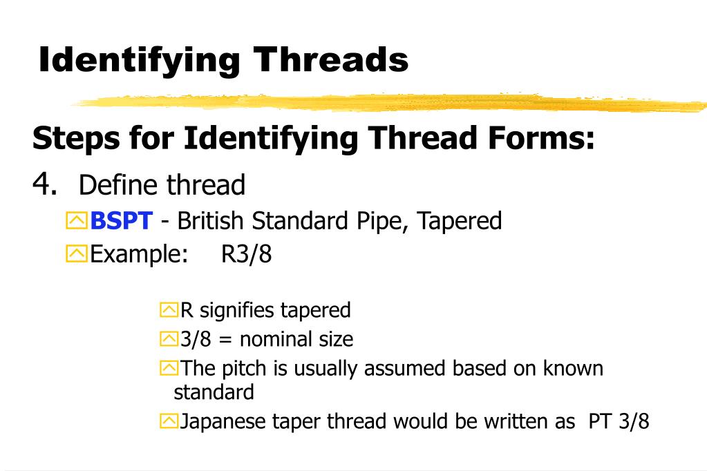Identifying Threads Steps for Identifying Thread Forms: 4. Define thread • BSPT- British Standard Pipe, Tapered • Example: R3/8 • R signifies tapered • 3/8 = nominal size • The pitch is usually assumed based on known standard • Japanese taper thread would be written as PT 3/8