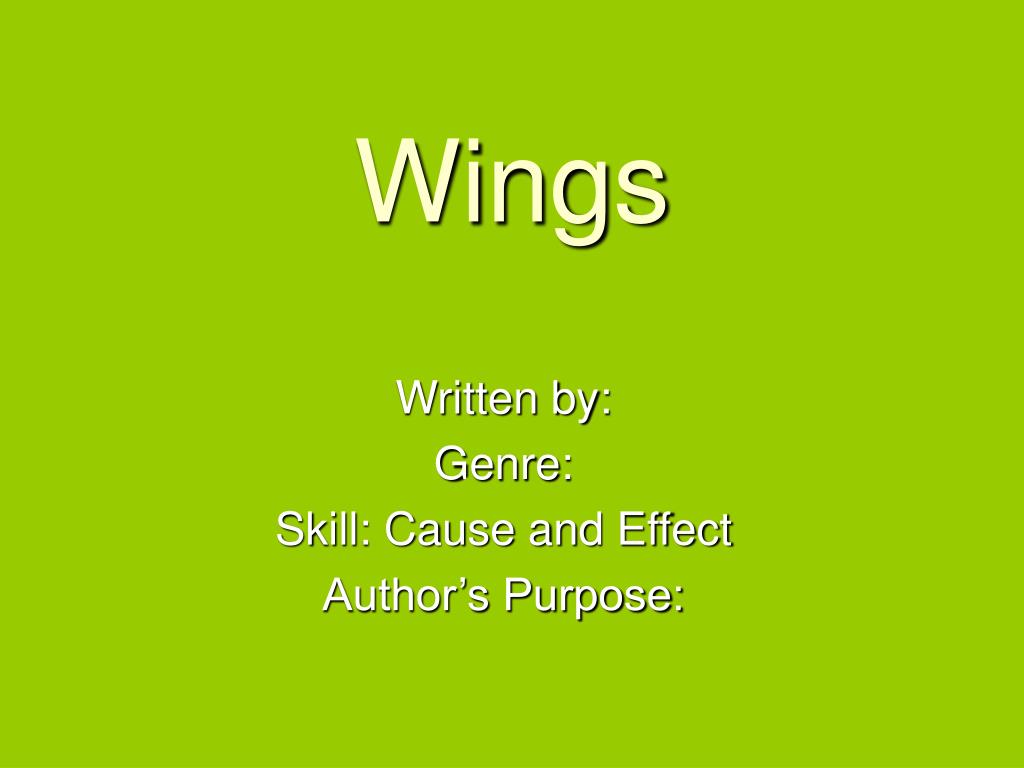 Wings Written by: Genre: Skill: Cause and Effect Author’s Purpose: