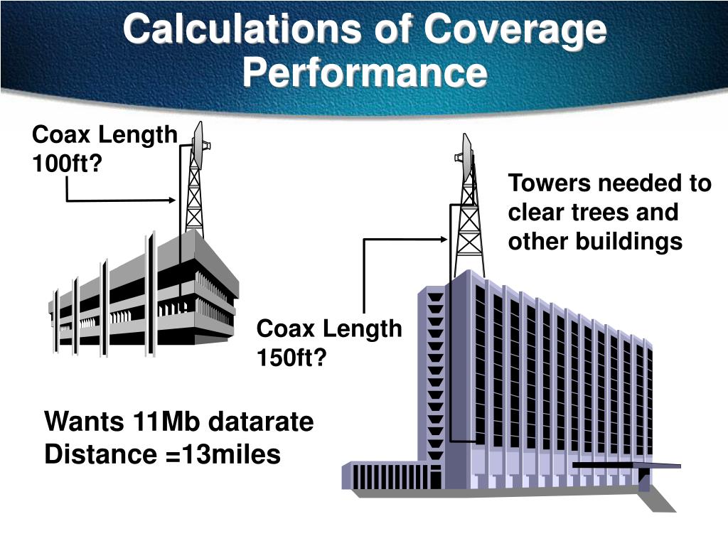 Calculations of Coverage Performance Coax Length 100ft? Towers needed to clear trees and other buildings Coax Length 150ft? Wants 11Mb datarate Distance =13miles