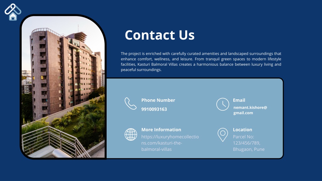 Contact Us The project is enriched with carefully curated amenities and landscaped surroundings that enhance comfort, wellness, and leisure. From tranquil green spaces to modern lifestyle facilities, Kasturi Balmoral Villas creates a harmonious balance between luxury living and peaceful surroundings. Phone Number Email nemant.kishore@gmail.com 9910093163 More Information Location https://luxuryhomecollections.com/kasturi-the-balmoral-villas Parcel No: 123/456/789, Bhugaon, Pune