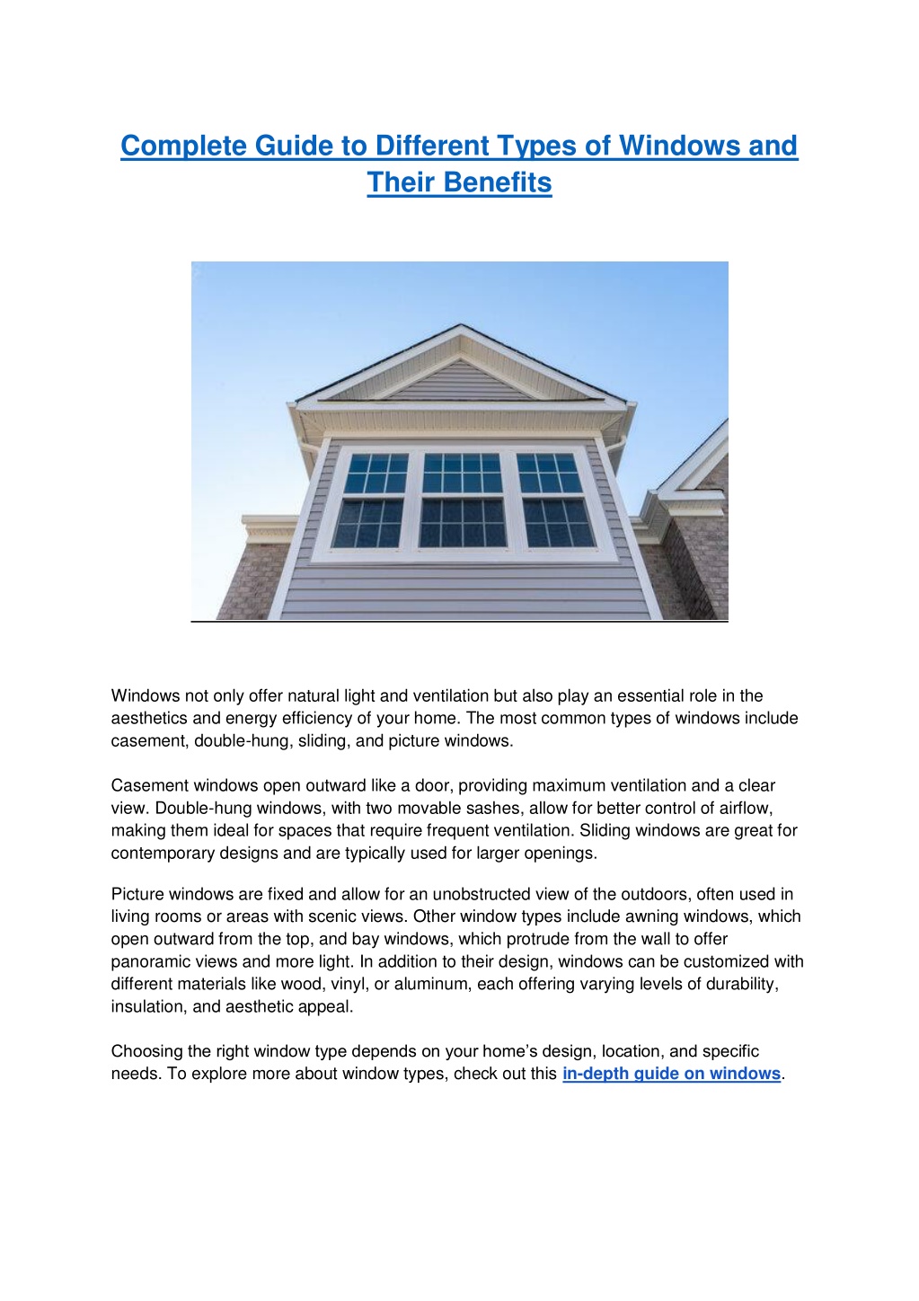 1. Complete Guide to Different Types of Windows and Their Benefits Windows not only offer natural light and ventilation but also play an essential role in the aesthetics and energy efficiency of your home. The most common types of windows include casement, double-hung, sliding, and picture windows. Casement windows open outward like a door, providing maximum ventilation and a clear view. Double-hung windows, with two movable sashes, allow for better control of airflow, making them ideal for spaces that require frequent ventilation. Sliding windows are great for contemporary designs and are typically used for larger openings. Picture windows are fixed and allow for an unobstructed view of the outdoors, often used in living rooms or areas with scenic views. Other window types include awning windows, which open outward from the top, and bay windows, which protrude from the wall to offer panoramic views and more light. In addition to their design, windows can be customized with different materials like wood, vinyl, or aluminum, each offering varying levels of durability, insulation, and aesthetic appeal. Choosing the right window type depends on your home’s design, location, and specific needs. To explore more about window types, check out this in-depth guide on windows.