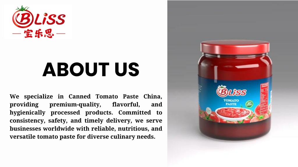 ABOUT US • We specialize in Canned Tomato Paste China, providing premium-quality, flavorful, and hygienically processed products. Committed to consistency, safety, and timely delivery, we serve businesses worldwide with reliable, nutritious, and versatile tomato paste for diverse culinary needs. • blisstomato.com