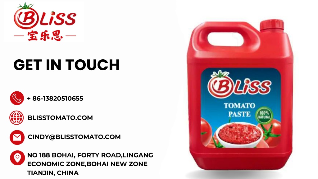 GET IN TOUCH • + 86-13820510655 • BLISSTOMATO.COM • CINDY@BLISSTOMATO.COM • NO 188 BOHAI, FORTY ROAD,LINGANG ECONOMIC ZONE,BOHAI NEW ZONE • TIANJIN, CHINA