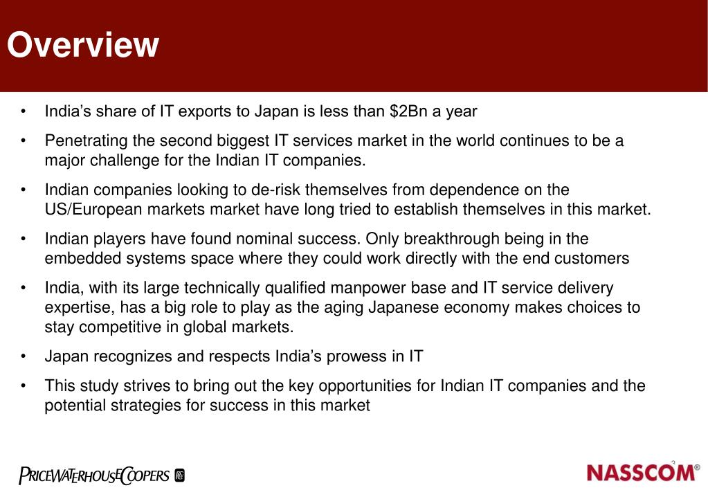 Overview • India’s share of IT exports to Japan is less than $2Bn a year • Penetrating the second biggest IT services market in the world continues to be a major challenge for the Indian IT companies. • Indian companies looking to de-risk themselves from dependence on the US/European markets market have long tried to establish themselves in this market. • Indian players have found nominal success. Only breakthrough being in the embedded systems space where they could work directly with the end customers • India, with its large technically qualified manpower base and IT service delivery expertise, has a big role to play as the aging Japanese economy makes choices to stay competitive in global markets. • Japan recognizes and respects India’s prowess in IT • This study strives to bring out the key opportunities for Indian IT companies and the potential strategies for success in this market