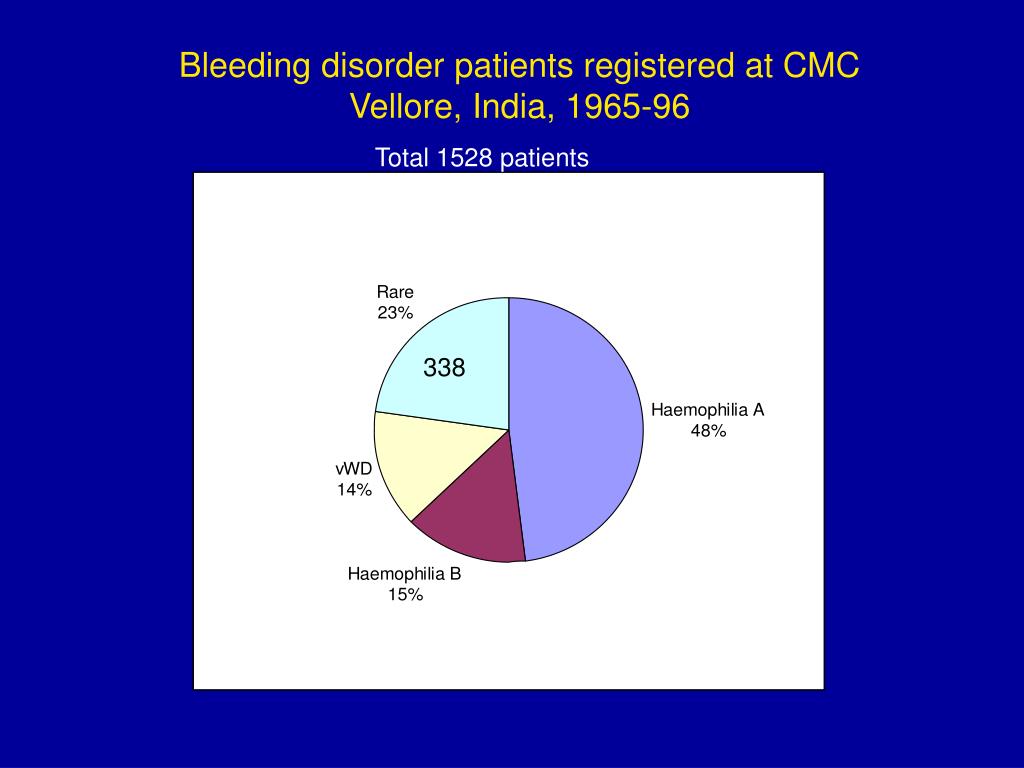 Rarer Haemostatic Disorders Treatments (see UKHCDO guidelines 2004 Haemophilia 10, 593-628). Paula Bolton-Maggs Consultant Haematologist Manchester Royal Infirmary, UK. Bleeding disorder patients registered at CMC Vellore, India, 1965-96. Total 1528 patients. 338.