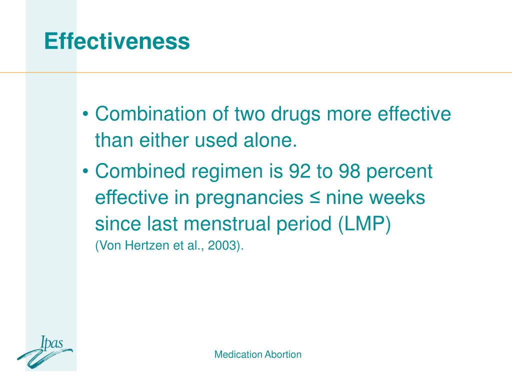 Effectiveness • Combination of two drugs more effective than either used alone. • Combined regimen is 92 to 98 percent effective in pregnancies ≤ nine weeks since last menstrual period (LMP) (Von Hertzen et al., 2003).