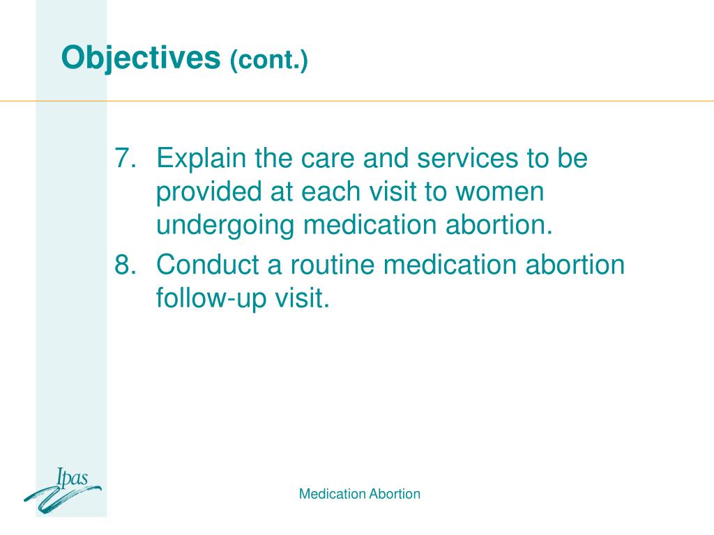 Objectives (cont.) • Explain the care and services to be provided at each visit to women undergoing medication abortion. • Conduct a routine medication abortion follow-up visit.