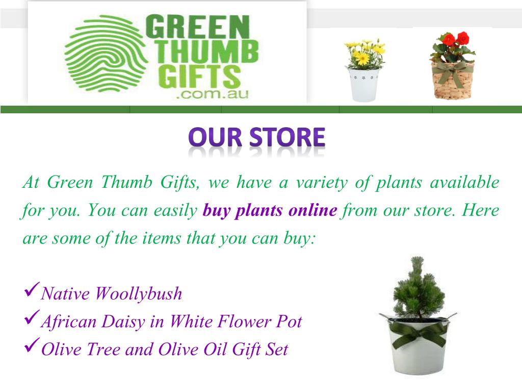 Our Store • At Green Thumb Gifts, we have a variety of plants available for you. You can easily buy plants onlinefrom our store. Here are some of the items that you can buy: • Native Woollybush • African Daisy in White Flower Pot • Olive Tree and Olive Oil Gift Set