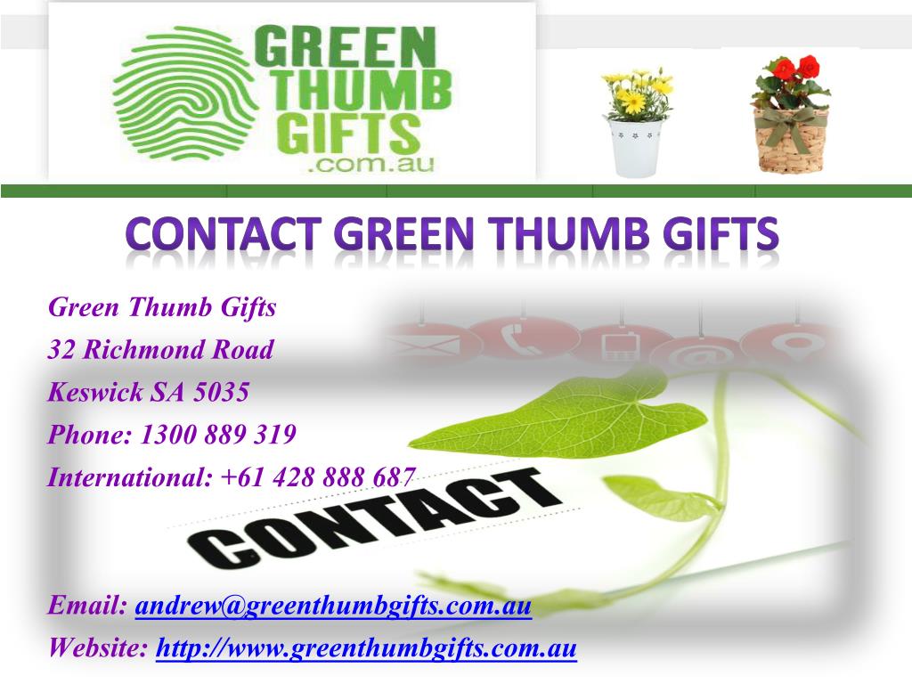 Contact Green thumb gifts Green Thumb Gifts 32 Richmond Road Keswick SA 5035 Phone: 1300 889 319 International: +61 428 888 687 Email: andrew@greenthumbgifts.com.au Website: http://www.greenthumbgifts.com.au