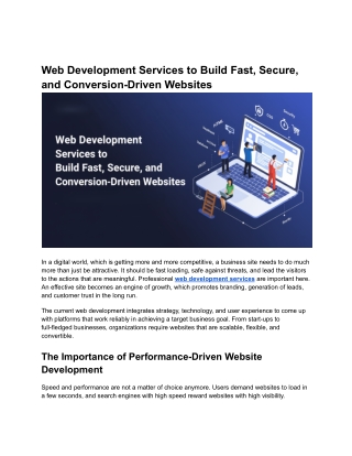 Web Development Services to Build Fast, Secure, and Conversion-Driven Websites In a digital world, which is getting more and more competitive, a business site needs to do much more than just be attractive. It should be fast loading, safe against threats, and lead the visitors to the actions that are meaningful. Professional web development services are important here. An effective site becomes an engine of growth, which promotes branding, generation of leads, and customer trust in the long run. The current web development integrates strategy, technology, and user experience to come up with platforms that work reliably in achieving a target business goal. From start-ups to full-fledged businesses, organizations require websites that are scalable, flexible, and convertible. The Importance of Performance-Driven Website Development Speed and performance are not a matter of choice anymore. Users demand websites to load in a few seconds, and search engines with high speed reward websites with high visibility.