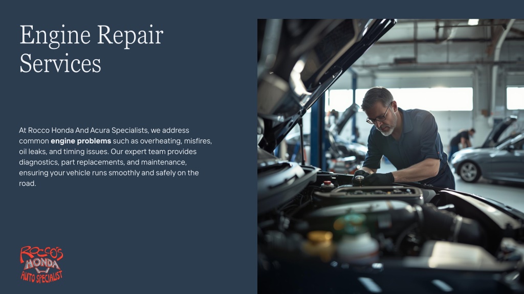 4. Engine Repair Services At Rocco Honda And Acura Specialists, we address common engine problems such as overheating, misfires, oil leaks, and timing issues. Our expert team provides diagnostics, part replacements, and maintenance, ensuring your vehicle runs smoothly and safely on the road.