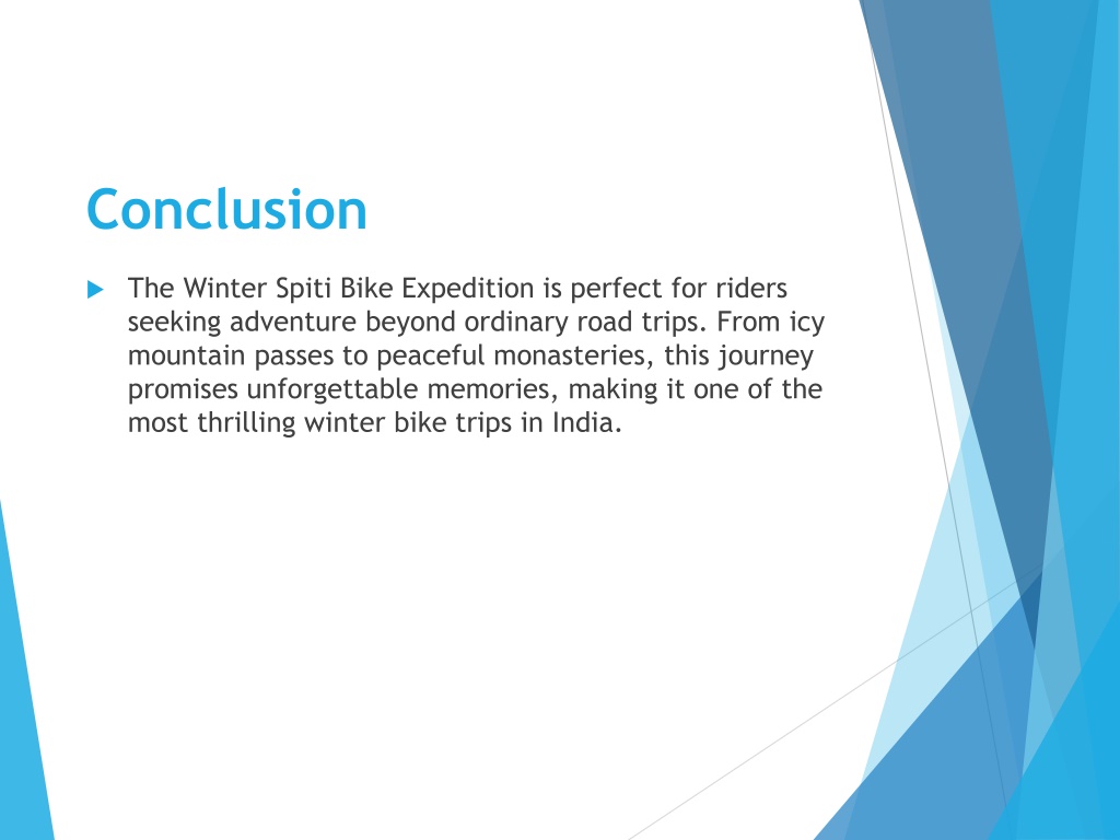 7. Conclusion • The Winter Spiti Bike Expedition is perfect for riders seeking adventure beyond ordinary road trips. From icy mountain passes to peaceful monasteries, this journey promises unforgettable memories, making it one of the most thrilling winter bike trips in India.