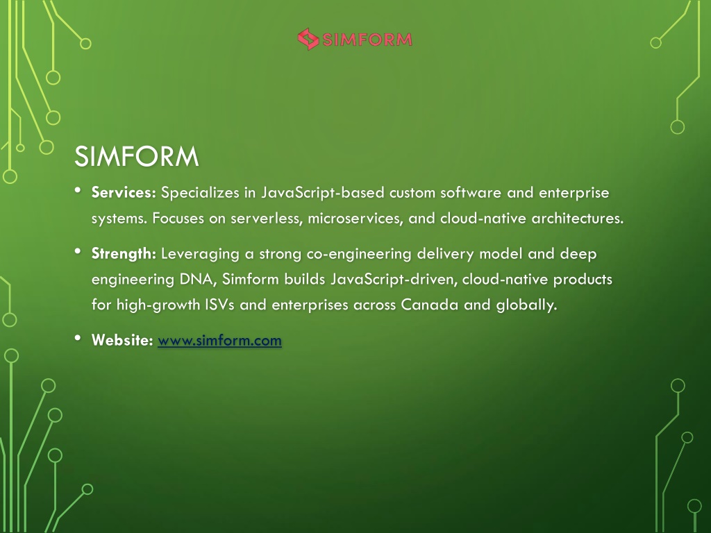 5. SIMFORM • Services: Specializes in JavaScript-based custom software and enterprise systems. Focuses on serverless, microservices, and cloud-native architectures. • Strength: Leveraging a strong co-engineering delivery model and deep engineering DNA, Simform builds JavaScript-driven, cloud-native products for high-growth ISVs and enterprises across Canada and globally. • Website: www.simform.com