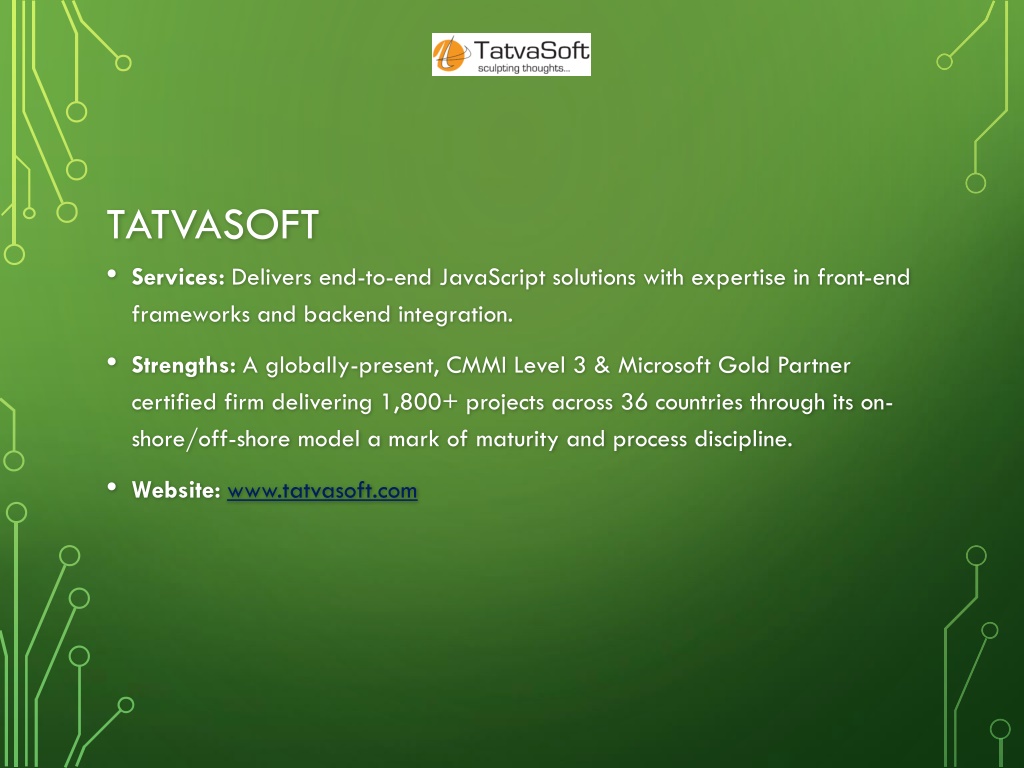 6. TATVASOFT • Services: Delivers end-to-end JavaScript solutions with expertise in front-end frameworks and backend integration. • Strengths: A globally-present, CMMI Level 3 & Microsoft Gold Partner certified firm delivering 1,800+ projects across 36 countries through its on- shore/off-shore model a mark of maturity and process discipline. • Website: www.tatvasoft.com