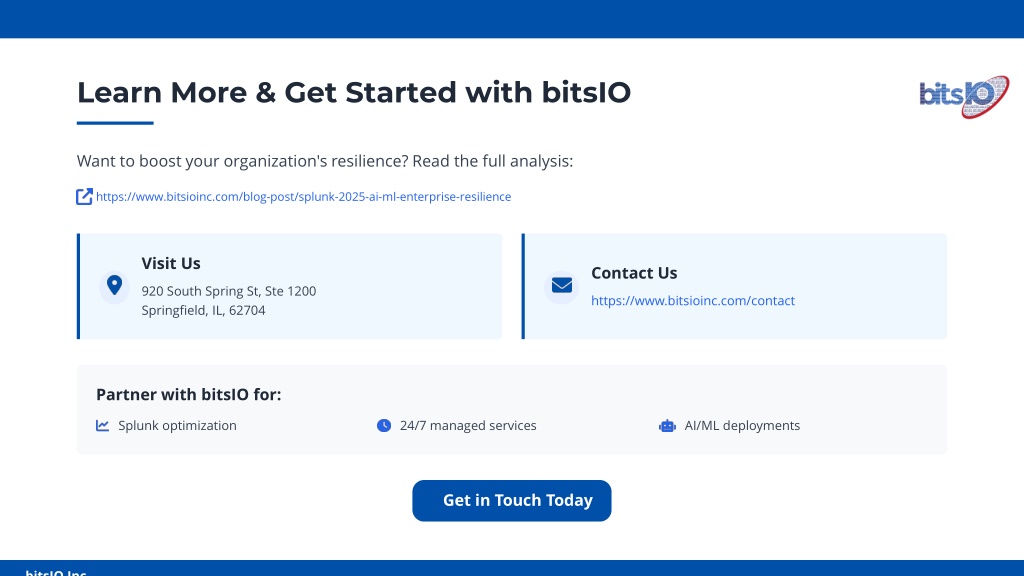 Learn More & Get Started with bitsIO Want to boost your organization's resilience? Read the full analysis: https://www.bitsioinc.com/blog-post/splunk-2025-ai-ml-enterprise-resilience Visit Us Contact Us 920 South Spring St, Ste 1200 https://www.bitsioinc.com/contact Springfield, IL, 62704 Partner with bitsIO for: Splunk optimization 24/7 managed services AI/ML deployments Get in Touch Today bitsIO Inc.